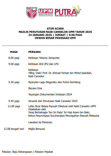 This ceremony was attended by more than 1,500 people, including academic staff, administration, as well as members of the student representative council of Universiti Putra Malaysia (UPM). The event started with the screening of a documentary montage looking back at the year 2024 before continuing with a message from the Vice Chancellor, Yang Berbahagia Dato' Professor Dr. Ahmad Farhan Mohd. Sadullah In his speech, he emphasized UPM's commitment to strengthen high-impact strategies through the True North framework in order to achieve a more sustainable future. With a focus on food security, environmental sustainability, and planetary health, UPM will introduce the Planet Health Blueprint, launch the Food Security Action Plan and strengthen community empowerment efforts.